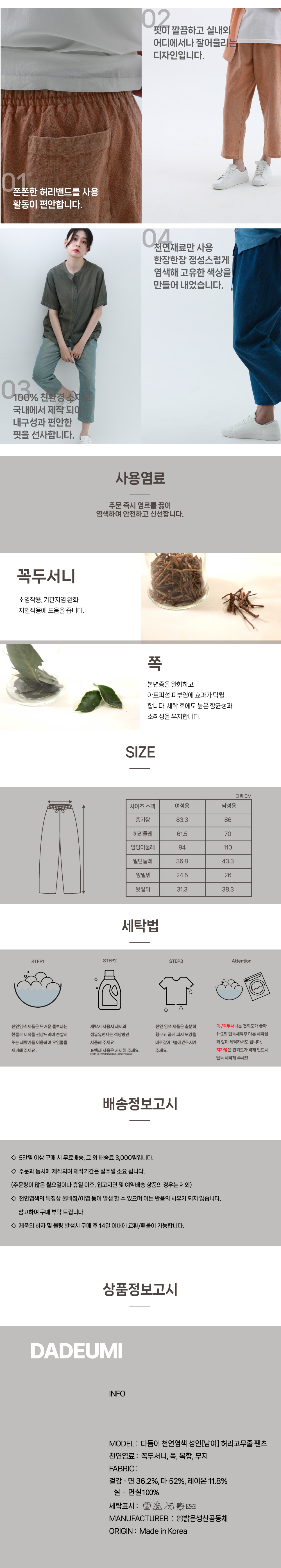 [천연염색 다듬이] 성인 허리 고무줄 바지 - 쪽
